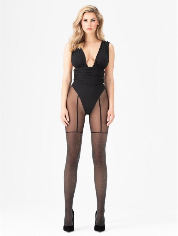 Te rajstopy przywodzą na myśl rozświetlone wybiegi wielkich pokazów mody lat 90. Twoje nogi też mogą lśnić iście w stylu glamour, dzięki srebrnej, lurexowej nitce - nasz gwiezdny pył doda Ci pewności siebie! Na udach w tym modelu proponujemy ultrakobiecy i kuszący wzór wydziany z cienkich, czarnych paseczków, za którymi odruchowo podąża wzrok.