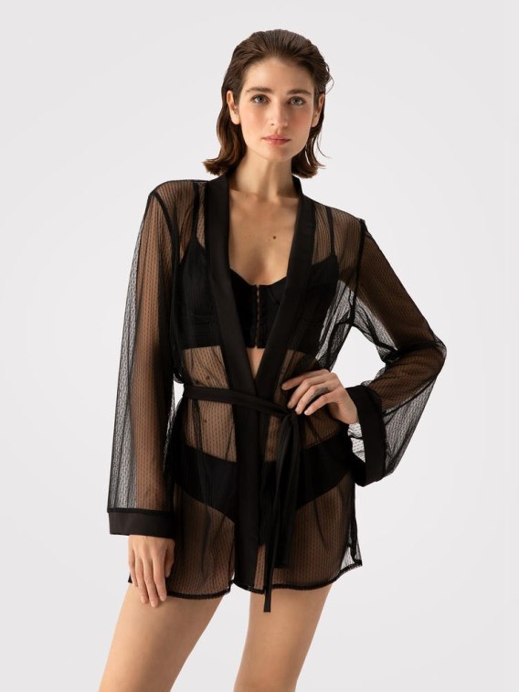 Peniuar o krótkim kroju. Przeźroczysta dzianina w delikatne punkciki. W pasie przewiązany szarfą. Długi rękaw zakończony luźnym mankietem.