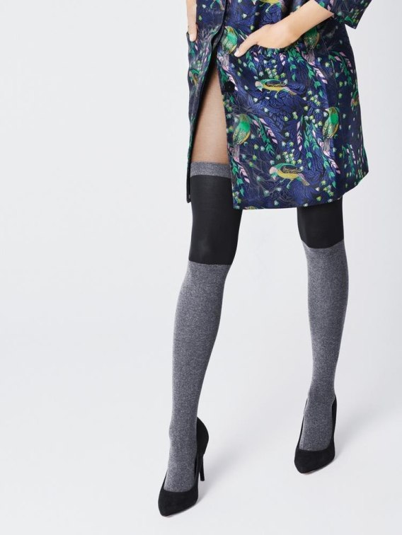 Rajstopy wzorzyste, kryjące, matowe, z komfortowym ściągaczem oraz płaskim szwem. Bawełniany klin w rozmiarach 3 i 4. Część majteczkowa typu t-band. Niewidocznie wzmocniona część palcowa. Melanżowy wzór imitujący pończochę. Skład: 79% Polyamid, 15% Polyester, 6% Elastane.