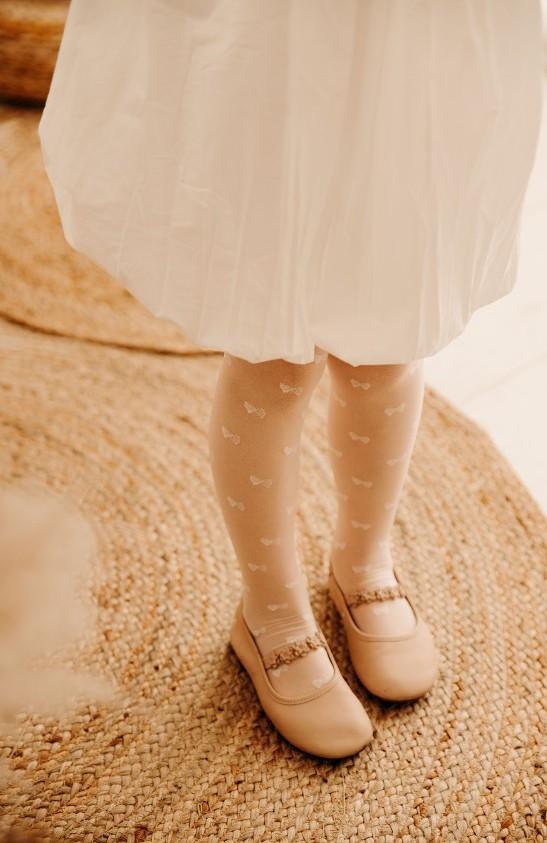 Rajstopy dziewczęce, ozdobione wzorem w kokardki, grubość 15 den, wygodny nieuciskający pas, wzmocnione palce, miłe, przyjemne w dotyku, idealne na wyjątkowe okazje.